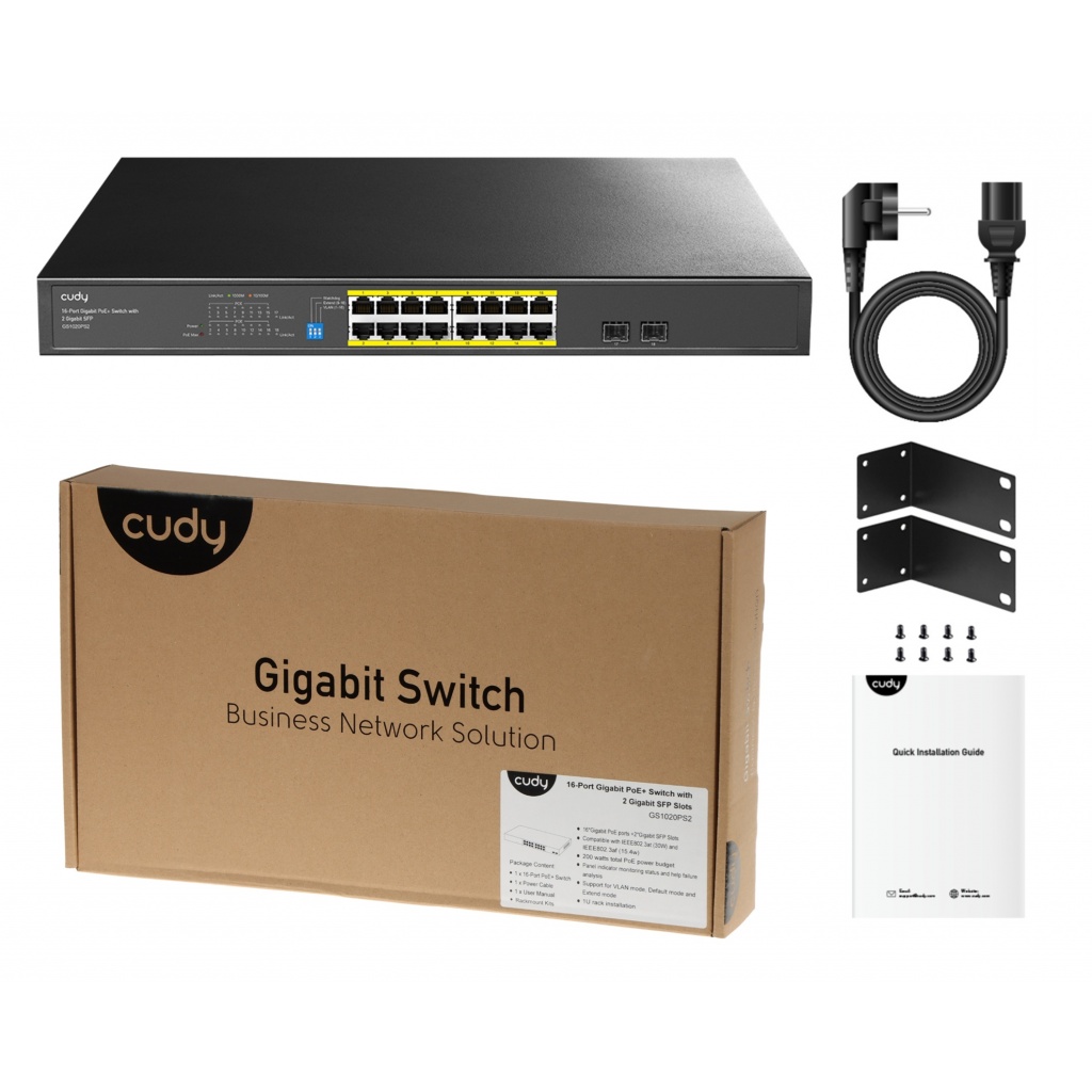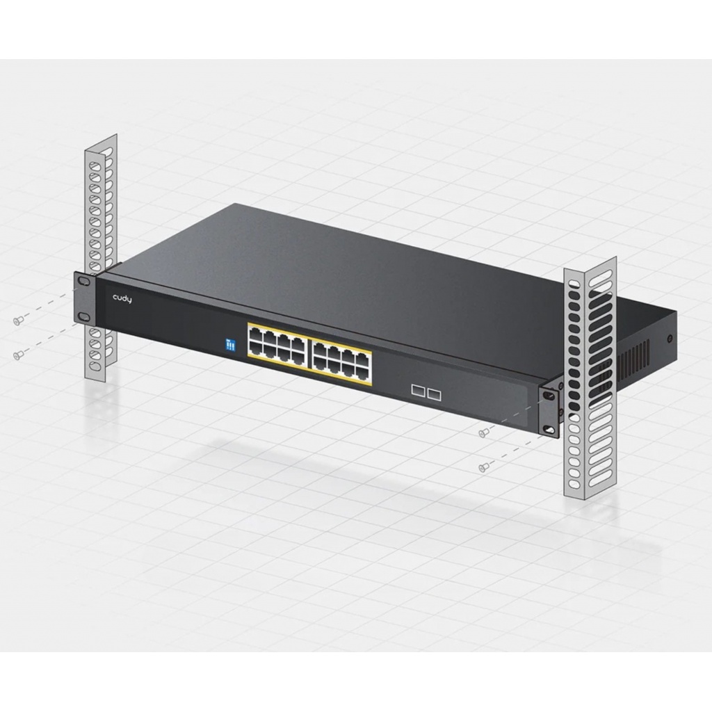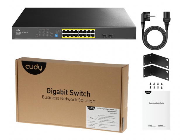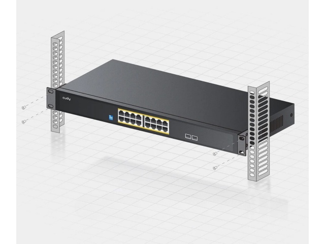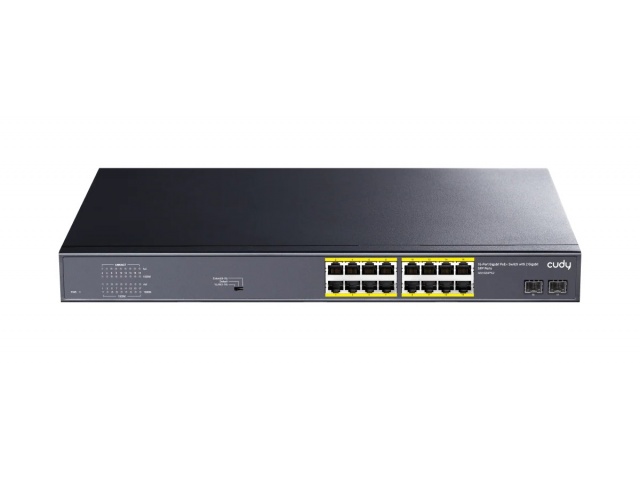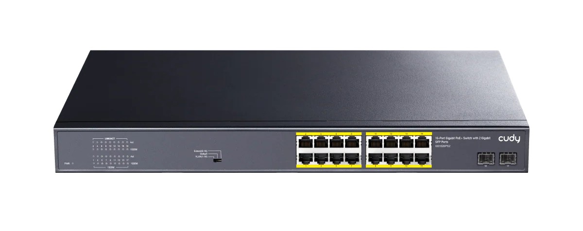 - Puertos: 16 Puertos Gigabit Ethernet PoE+ y 2 Puertos SFP para conectividad adicional de fibra óptica, mejorando la flexibilidad y el rendimiento de la red.