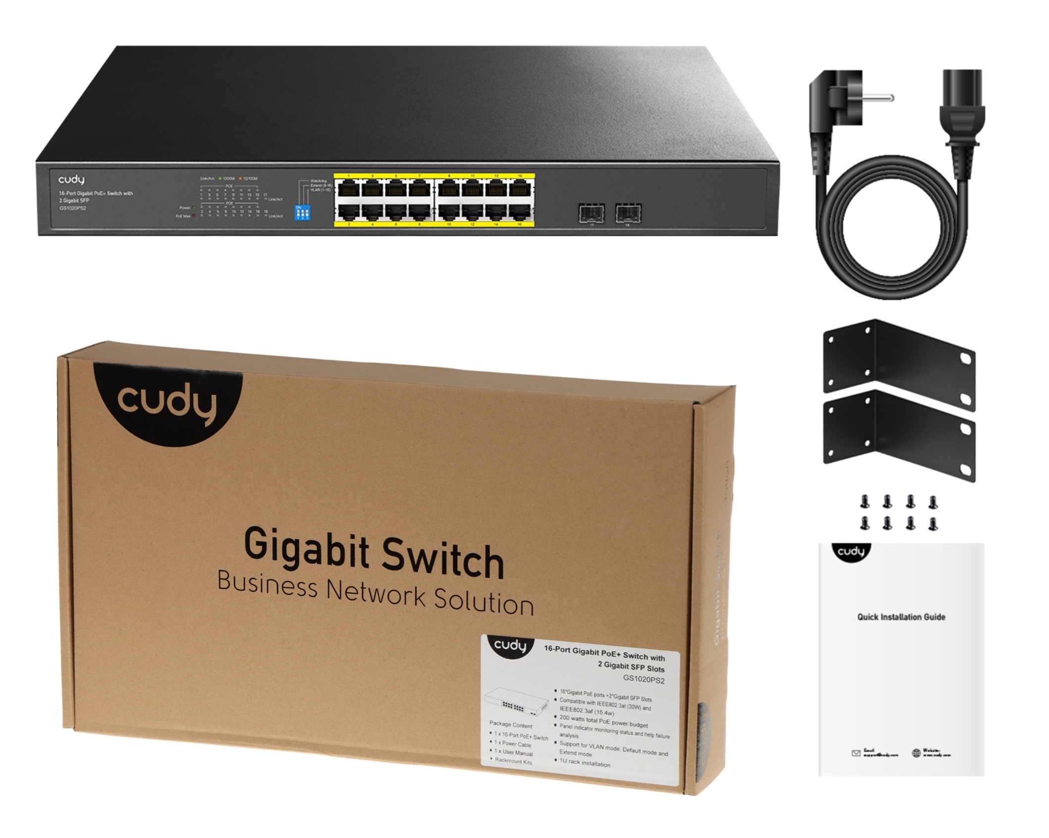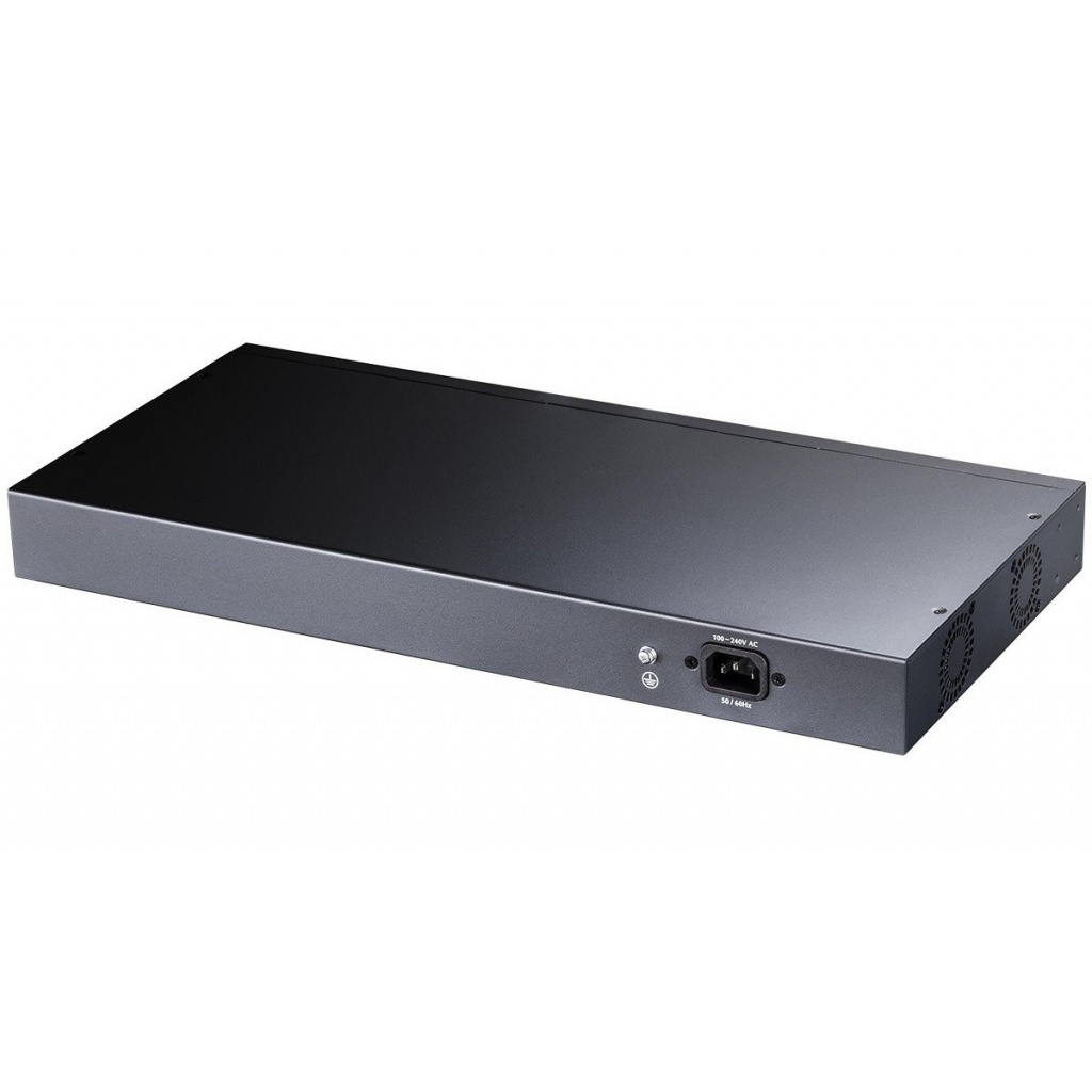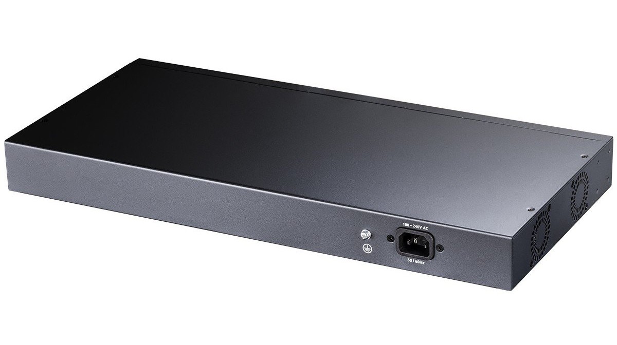 - Puertos: 16 Puertos Gigabit Ethernet PoE+ y 2 Puertos SFP para conectividad adicional de fibra óptica, mejorando la flexibilidad y el rendimiento de la red.