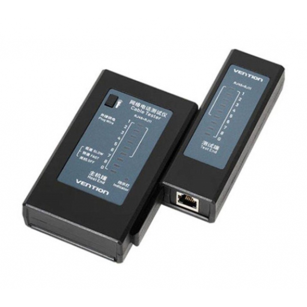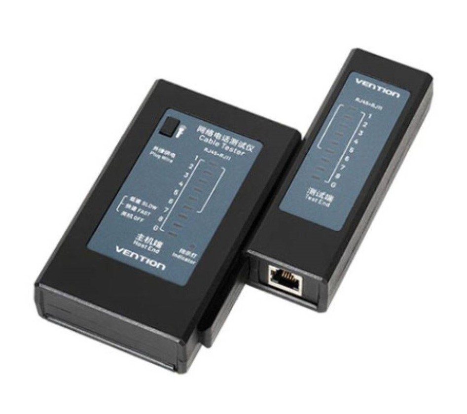 Probador de cables de red diseñado para verificar la integridad y continuidad de cables RJ45 (Ethernet) y RJ11 (telefónicos).