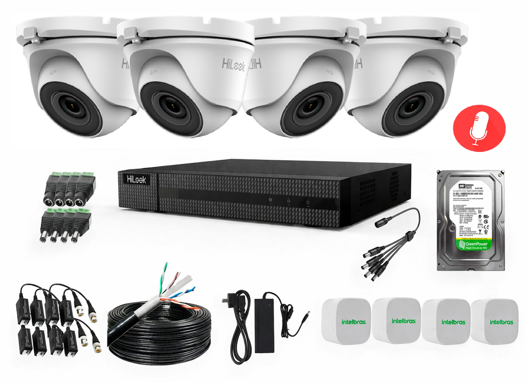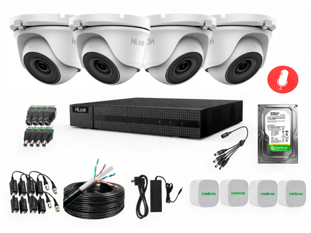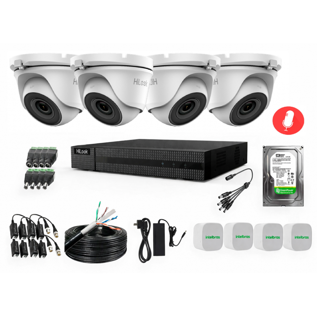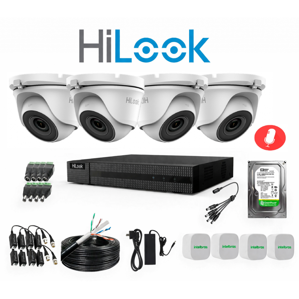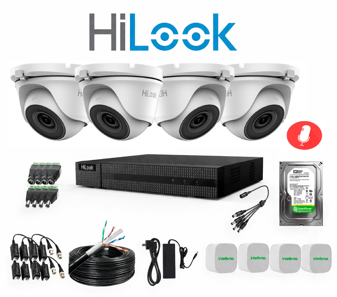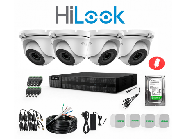 KIT HILOOK DVR 4CH + 4 CAMARAS 2MP TURRET METAL C/MIC + DISCO